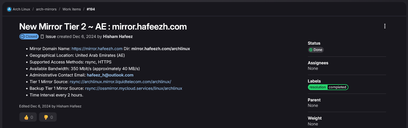 As a matter of fact, this is the only Arch Linux mirror in the UAE. Or any Linux mirror, for that matter. This piqued my interest even more; who was behind this?